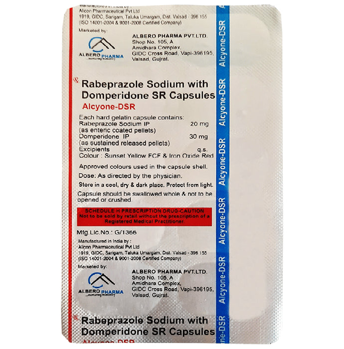 Alcyone-DSR Capsule is a combination medicine used to treat gastroesophageal reflux disease (Acid reflux). It works by relieving the symptoms of acidity such as heartburn, stomach pain, or irritation. It also neutralizes the acid and promotes easy passage of gas to reduce stomach discomfort. Alcyone-DSR Capsule is taken without food in a dose and duration as advised by the doctor. The dose you are given will depend on your condition and how you respond to the medicine. You should keep taking this medicine for as long as your doctor recommends. If you stop treatment too early your symptoms may come back and your condition may worsen. Let your healthcare team know about all other medications you are taking as some may affect, or be affected by this medicine.The most common side effects are diarrhea, stomach pain, dryness in the mouth, headache, flatulence, and weakness. Most of these are temporary and usually resolve with time. Contact your doctor straight away if you are at all concerned about any of these side effects. This medicine may cause dizziness and sleepiness, so do not drive or do anything that requires mental focus until you know how this medicine affects you. Avoid drinking alcohol while taking this medicine as it can worsen your sleepiness. Lifestyle modifications like having cold milk and avoiding hot tea, coffee, spicy food or chocolate can help you to get better results.Before you start taking this medicine it is important to inform your doctor if you are suffering from kidney or liver disease. You should also tell your doctor if you are pregnant, planning pregnancy or breastfeeding.