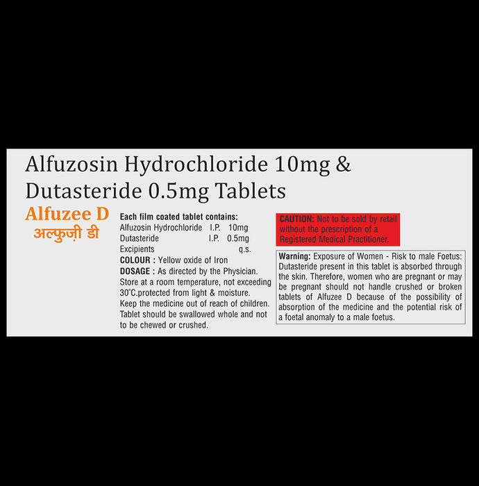 Alfuzee D Tablet is a combination of two medicines that work in different ways to treat men with an enlarged prostate gland. It helps to relieve symptoms such as difficulty urinating or needing to go to the toilet more often. It is not used to prevent prostate cancer.Alfuzee D Tablet should be taken immediately after the same meal each day. Take it as a whole, do not break, chew, or crush them. Your doctor will prescribe the dose most suitable for you. To gain the most benefit and treat your symptoms effectively you should not miss doses, even if you feel well. It may take up to 4 weeks to notice an improvement in symptoms but keep taking them regularly. Tell your doctor if your symptoms do not improve after 4 weeks or if they get worse.The most common side effects of this medicine include decreased libido, inability to get an erection (impotence), and tenderness or enlargement of your breasts. If these effects worry you or do not go away, call your doctor for advice. You may also feel dizzy or drowsy. These risks are higher when you first start taking this drug. Remember, your doctor has given you this medicine because the benefits are greater than the risks of the side effects.Alfuzee D Tablet should not be taken by women or children. Before taking it, tell your doctor if you have low blood pressure or liver or kidney disease. This medicine may not be suitable. It can also affect, or be affected by, other drugs so let your doctor know all other medicines you are taking. You may be advised to wear a condom during sex and to have your blood pressure checked frequently. Talk to your healthcare team if you drink alcohol.