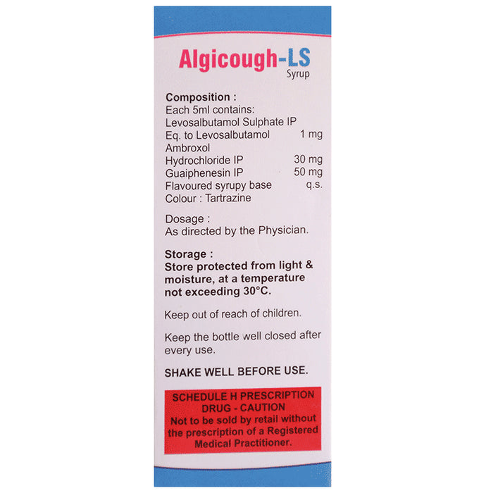 Algicough-LS Syrup is used in the treatment of cough with mucus. It thins mucus in the nose, windpipe and lungs, making it easier to cough out. It also provides relief from runny nose, sneezing, itching, and watery eyes. Algicough-LS Syrup is taken with or without food in a dose and duration as advised by the doctor. The dose you are given will depend on your condition and how you respond to the medicine. You should keep taking this medicine for as long as your doctor recommends. If you stop treatment too early your symptoms may come back and your condition may worsen. Let your healthcare team know about all other medications you are taking as some may affect, or be affected by this medicine.The most common side effects are dizziness, vomiting, change in taste, diarrhea, headache, and rashes. Most of these are temporary and usually resolve with time. Contact your doctor straight away if you are at all concerned about any of these side effects. This medicine can also cause sleepiness, so do not drive or do anything that requires mental focus until you know how this medicine affects you. Avoid drinking alcohol while taking this medicine as it can make sleepiness worse.Never support self-medication or recommend your medicine to another person. It is beneficial to have plenty of fluids while taking this medication. Before taking this medicine, you should tell your doctor if you are pregnant, planning pregnancy or breastfeeding. You should also tell your doctor if you have any kidney or liver diseases so that your doctor can prescribe a suitable dose for you.