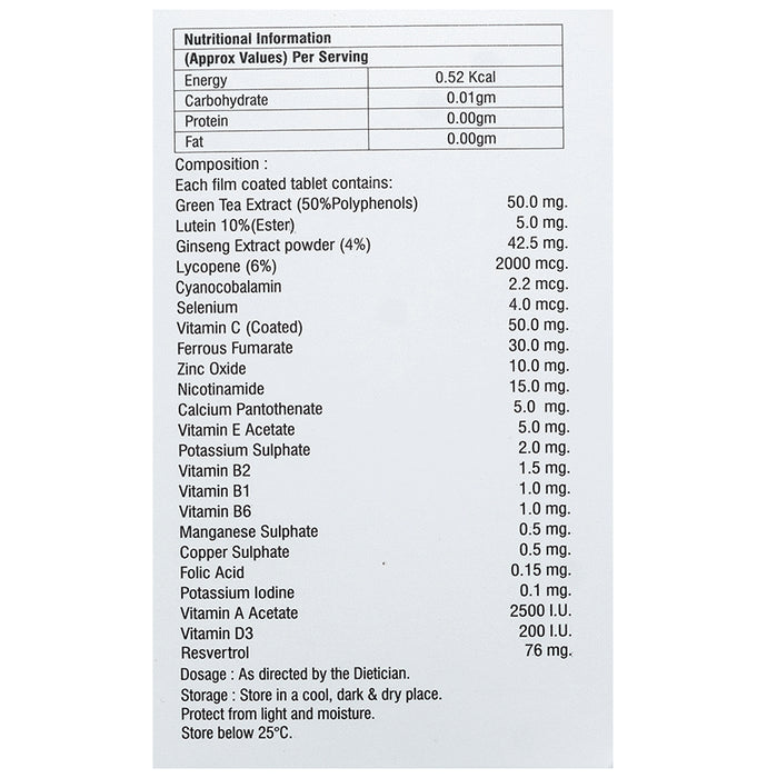 Composition : Green Tea Extract,Lutein 10%,Ginseng Extract powder,Lycopene,Cyanocobalamin,Selenium,Vitamin C,Ferrous Fumarate,Zinc Oxide,Nicotinamide,Calcium Pantothenate,Vitamin E Acetate,Potassium Sulphate,Vitamin B1 (Thiamine),Vitamin B6 (Pyridoxine),Manganese Sulphate,Copper Sulphate,Folic Acid,Potassium Iodine,Vitamin A Acetate,Vitamin D3,Resveratrol