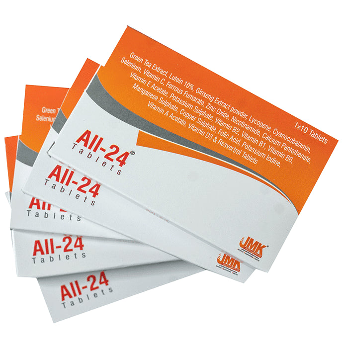 All 24 Tablet is a comprehensive multivitamin and mineral supplement formulated to provide essential nutrients that support overall health and well-being. It contains a combination of vitamins, minerals, and herbal extracts known for their beneficial effects on various body functions.