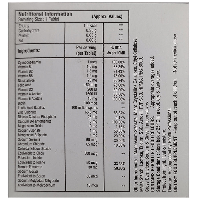 Composition : Cyanocobalamin,Vitamin B6,Folic Acid,Vitamin D3,Lactic Acid Bacillus,Zinc Sulphate,Manesium Oxide,Ferrous Furnarate