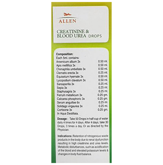 Allen A87 Creatinine & Blood Urea Drop is a medication that may help manage the retention of nitrogenous waste products in the body due to renal dysfunction, resulting in high creatinine and urea levels. This drop can help handle the acidification of the blood, elevated potassium levels and changes in body fluid balance. It can help deal with metabolic disturbances.Key IngredientsArsenicum Album 3x, Apis Mellifica 3x, Chimaphila Umbellate 3x, Clematis Erecta 3x, Equisetum Hyemale 3x, Lycopodium Clavatum 3x, Sarsaparilla 3x, Staphysagria 3x, Ferrum Metallicum 3x, Calcarea Phosphrica 3x, Serum Anguillae 6x, Solidago Virgaurea 3xCortisone 3x in aqua destillataIndications Retention of nitrogenous waste products in the body due to renal dysfunction resulting in high creatinine and urea levelsMetabolic disturbances, such as acid function of the blood and elevated potassium levels and changes in body fluid balanceNet Quantity:30 ml.Product Form:Drops.Key Benefits:It can help reduce the nitrogenous waste products in the bodyThe drop can be beneficial in managing high creatinine and urea levelsSerum anguilae can help minimise the risk of kidney infectionsThis formulation helps deal with metabolic disturbancesDosageTake 15 drops in half a cup of water daily four times for four daysAfter four days, reduce the dosage to 30 drops 3 times a day or as directed by your physicianSafety Information Self-medication is not advisableRead the label carefully before useStore in a cool and dry place, away from sunlightKeep out of reach of childrenDon't exceed the recommended dosageUse under medical supervisionAvoid any strong smell in the mouth, such as coffee, onion, hing, mint, camphor, garlic etc., while taking medicineAvoid eating tobacco or drinking alcohol during the course