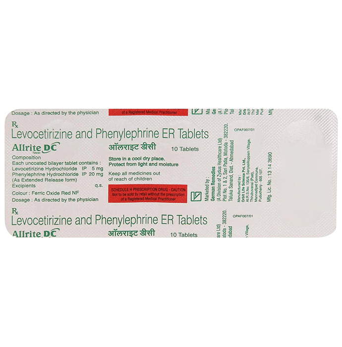 Allrite DC Tablet ER is a combination medicine used in the treatment of allergy symptoms like runny nose, sneezing, throat irritation, watery eyes and congestion or stuffiness in the nose. Allrite DC Tablet ER is taken with or without food in a dose and duration as advised by the doctor. The dose you are given will depend on your condition and how you respond to the medicine. You should keep taking this medicine for as long as your doctor recommends. If you stop treatment too early your symptoms may come back and your condition may worsen. Let your healthcare team know about all other medications you are taking as some may affect, or be affected by this medicine.The most common side effects are headache, dryness in mouth, nausea, vomiting, restlessness, and tiredness. Most of these are temporary and usually resolve with time. Contact your doctor straight away if you are at all concerned about any of these side effects. It can also cause dizziness and sleepiness, so do not drive or do anything that requires mental focus until you know how this medicine affects you. Avoid drinking alcohol while taking this medicine as it can worsen your sleepiness.Never support self-medication or recommend your medicine to another person. It is beneficial to have plenty of fluids while taking this medication. Before taking it, you should tell your doctor if you have any liver or kidney diseases so that your doctor can prescribe a suitable dose for you. Also tell your doctor if you are pregnant, planning pregnancy or breastfeeding.