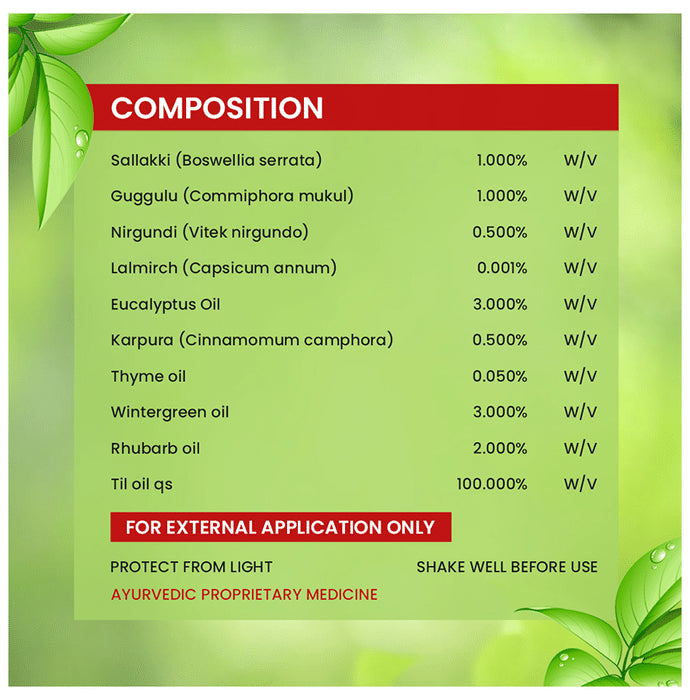 Composition : Eucalyptus oil,Rhubarb oil,Wintergreen oil,Lal Mirch,Thyme,Til oil