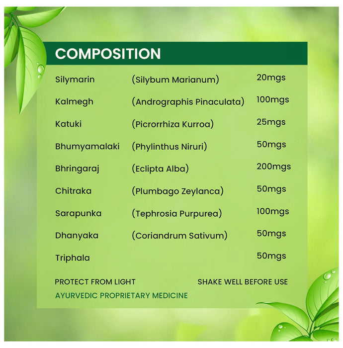 Composition : Silymarin,Kalmegh,Sarapunka,Bhumyamalaki,Chitraka,Bhringraj,Katuki,Dhanyaka