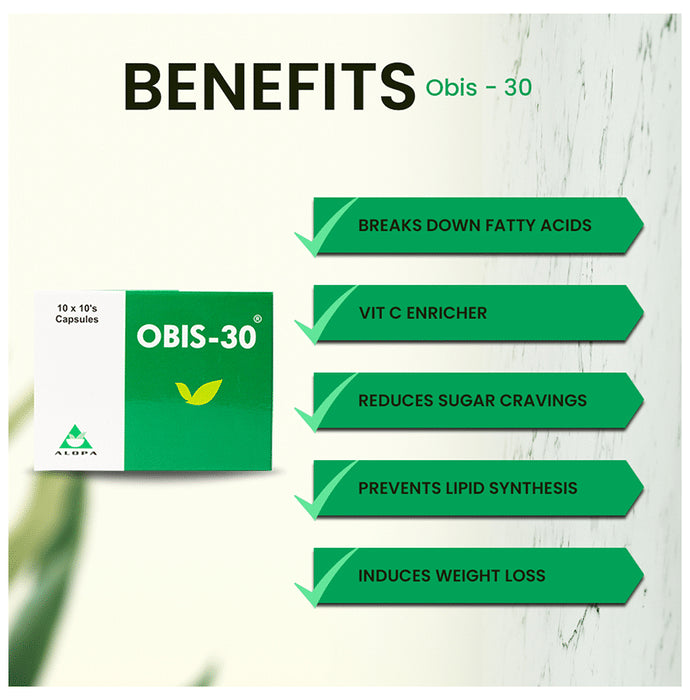 Alopa Obis-30 Capsule is an effective supplement enriched with vitamin C that helps break down fatty acids. It can also help to reduce sugar cravings and aids in weight loss. It also helps to prevent lipid synthesis