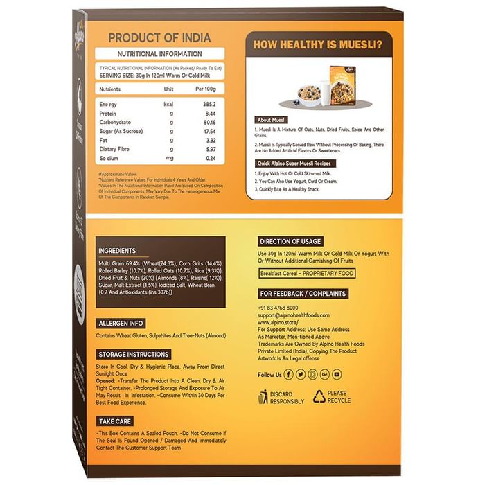 Alpino Super Muesli (400gm Each) keeps one full for a longer time and is rich in protein and iron. It contains healthy fatty acids which help to maintain a healthy weight.