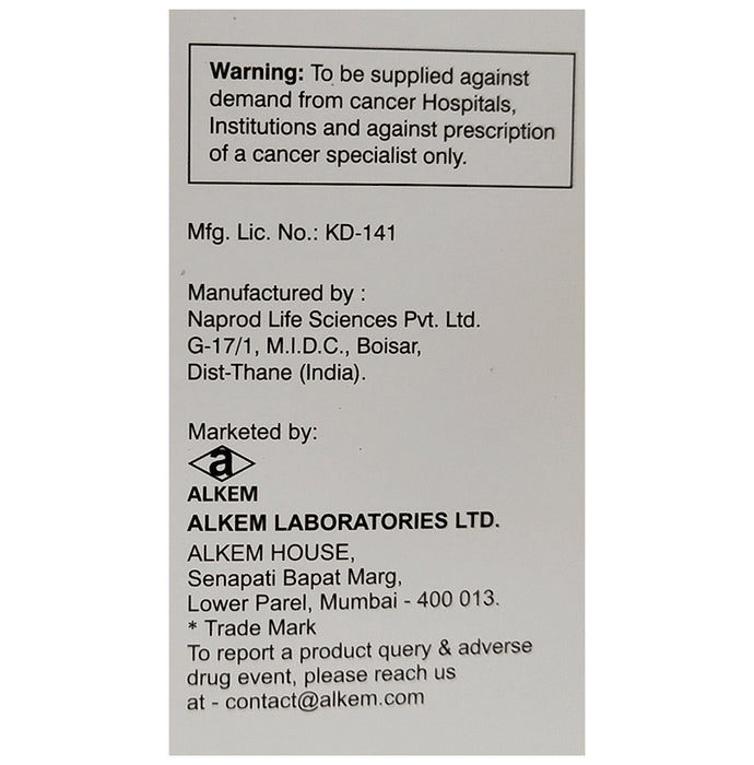 Alrubicin 50 Injection is used in the treatment of various types of cancers of blood, breast, stomach, lung, ovaries and soft tissues. It also helps to prevent the recurrence of bladder cancer after surgery. It is given as a drip or infusion vein with extreme caution by a qualified medical professional. It can be used alone, or sometimes given together with certain other medicines as part of combination chemotherapy. Your doctor will decide what dose is necessary and how often you need to take it. This will depend on what you are being treated for and may change from time to time. You should take it exactly as your doctor has advised. Taking it in the wrong way or taking too much can cause very serious side effects. It may take several weeks or months for you to see or feel the benefits but do not stop taking it unless your doctor tells you to. It makes contraceptive pills less effective, so it advised to both male and female to use reliable contraception during the treatment.The most common side effects of this medicine include nausea, low blood platelets, hair loss, absence of menstrual periods, fever and rash. It is known to reduce the number of blood cells in your blood thereby, increasing the susceptibility to infections. Infections can sometimes be life threatening. Regular blood tests are required to monitor your blood cells along with kidney, liver and heart function during treatment with this medicine.Before taking this medicine, tell your doctor if you have liver disease, or have heart problem. Your doctor should also know about all other medicines you are taking as many of these may make this medicine less effective or change the way it works. Inform your doctor if you are pregnant or breastfeeding.
