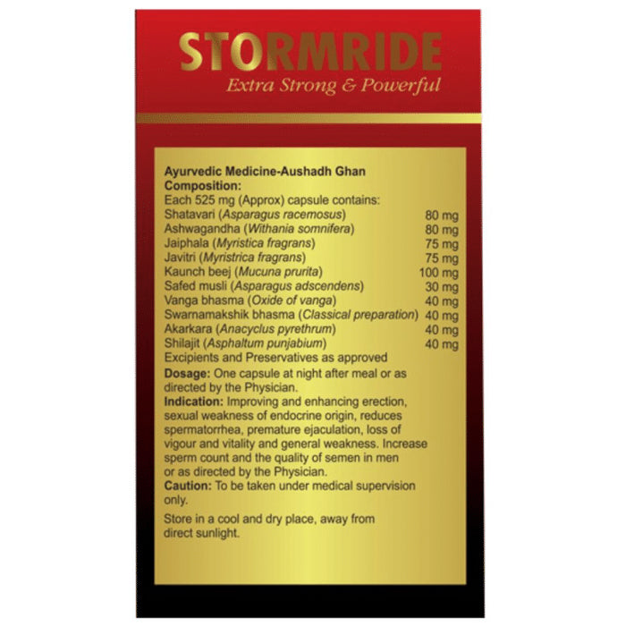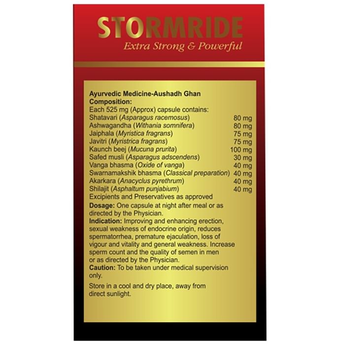 Alsence Stormride CapsuleIt is a dietary supplement formulated with ashwagandha, shilajit, kesar, shatavari, kaunch beej, swarna bhasma, heera bhasma and other herbs to improve your vitality, strength and stamina. It can help improve your physical performance and relieve fatigue. It may act as a revitaliser and help manage the body's stress and immune function, thereby improving physical and mental health.