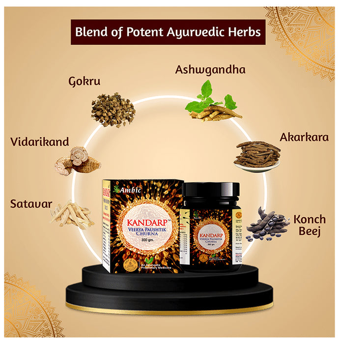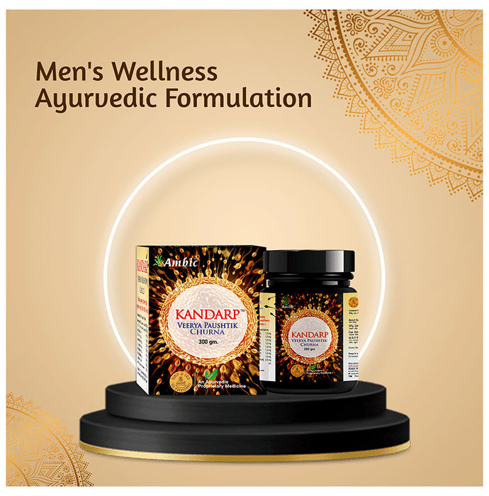 Ambic Kandarp Veerya Paushtik Churna is expertly formulated with hand-selected herbs, including ashwagandha, shilajit, salam panja, and loh bhasma, to improve performance and improve timing in men. It serves as a daily energiser and eases worry and tension. This Ayurvedic stimulant also aids in reviving the body.