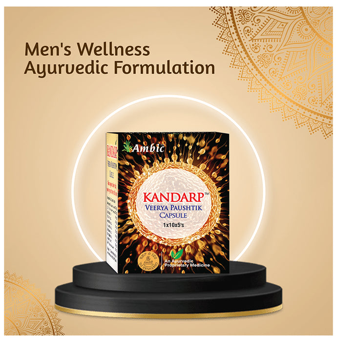 Ambic Kandrap Capsule is carefully crafted with handpicked herbs like ashwagandha, shilajit, salam panja, and loh bhasma, which helps enhance performance and increases timing in men. It acts as a daily energiser and helps cope with stress and anxiety. This Ayurvedic booster also helps to revitalise the body.