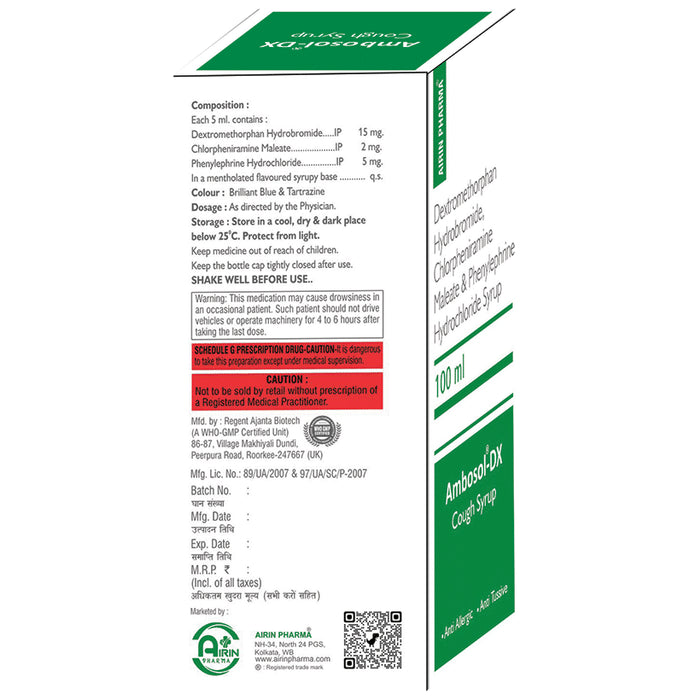 Ambosol-DX Syrup is a medicine used in the treatment of common cold and cough. It can provide quick relief from cough and common cold symptoms like runny nose, stuffy nose, sneezing, watery eyes, and congestion or stuffiness. Ambosol-DX Syrup is taken with or without food in a dose and duration as advised by the doctor. The dose you are given will depend on your condition and how you respond to the medicine. You should keep taking this medicine for as long as your doctor recommends. If you stop treatment too early your symptoms may come back and your condition may worsen. Let your healthcare team know about all other medications you are taking as some may affect, or be affected by this medicine.Common side effects of this medicine include headache, sedation, double vision, vomiting, diarrhea, dry mouth, and nausea. Most of these are temporary and usually resolve with time. Contact your doctor straight away if you are at all concerned about any of these side effects. This medicine can also cause sleepiness, so do not drive or do anything that requires mental focus until you know how this medicine affects you. Avoid drinking alcohol while taking this medicine as it can worsen your sleepiness.Never support self-medication or recommend your medicine to another person. It is beneficial to have plenty of fluids while taking this medication. Before taking this medicine, you should tell your doctor if you are pregnant, planning pregnancy or breastfeeding. You should also tell your doctor if you have any kidney or liver diseases so that your doctor can prescribe a suitable dose for you.