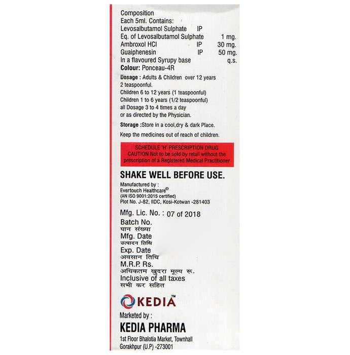 Composition : Ambroxol (30mg/5ml) + Levosalbutamol (1mg/5ml) + Guaifenesin (50mg/5ml)