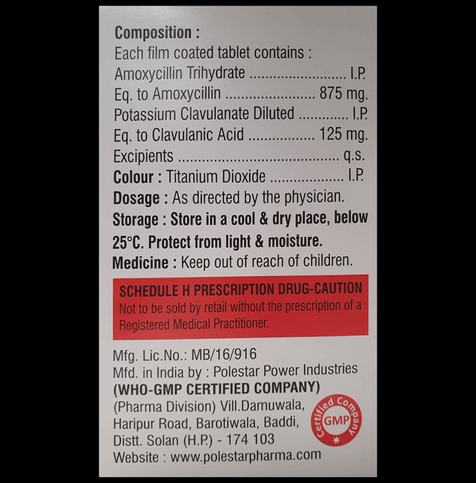 Composition : Amoxycillin (875mg) + Clavulanic Acid (125mg)