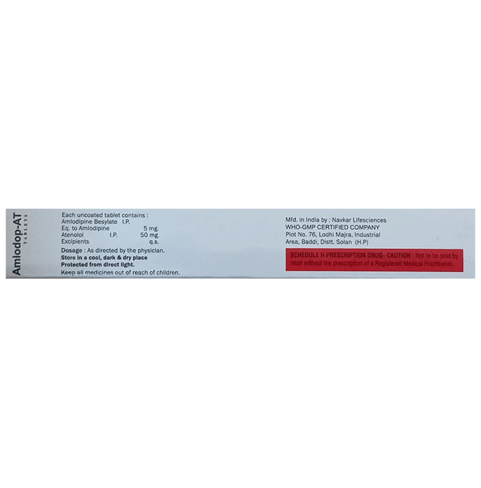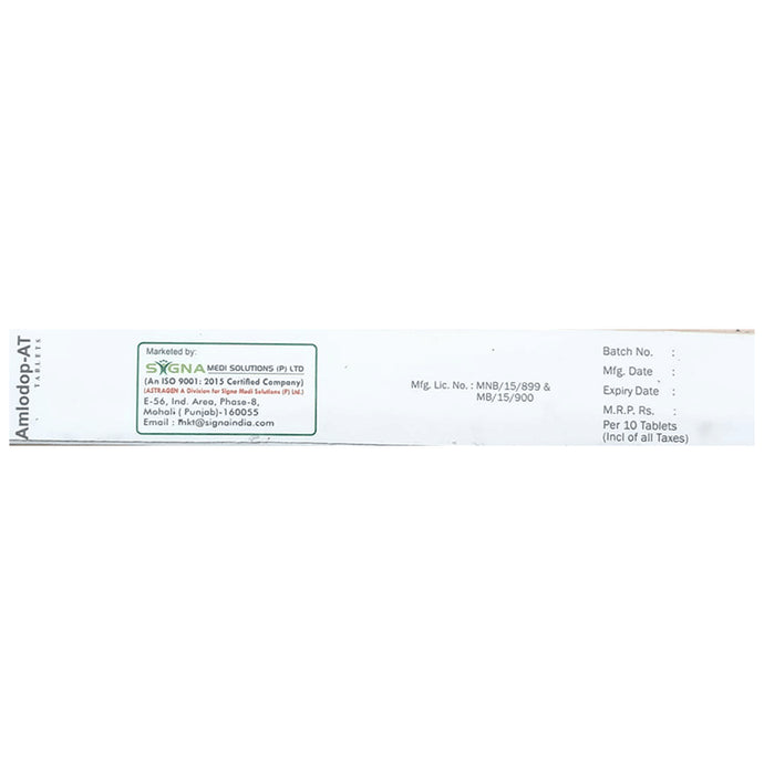 Amlodop-AT Tablet is used to treat hypertension (high blood pressure) and angina. This is a combination of two medicines that controls blood pressure when a single medication is not effective. It helps to lower high blood pressure and thus reduces the chances of future heart attack and stroke. Amlodop-AT Tablet may be taken with or without food. Take it at the same time each day. Keep taking it for as long as advised by your doctor. Even if you feel well, do not stop this medicine on your own because high blood pressure often has no symptoms. If you stop taking it, your condition may get worse. Keeping active with regular exercise, reducing your weight and eating a healthy diet will also help control your blood pressure. Follow your doctor’s advice while taking this medicine.It may cause side effects like headache, slow heart rate, and nausea. It may also cause dizziness, so do not drive or do anything that requires mental focus until you know how this medicine affects you. This might raise the level of potassium in the blood, hence avoid potassium rich food or supplements. You may be asked for regular monitoring of blood pressure, kidney function, and electrolytes level while on the treatment.Before taking it, let your doctor know if you have any liver or kidney problems. Pregnant or breastfeeding women should also consult their doctor for advice before taking this medicine. You also need to tell your doctor what other medicines you are taking especially those used to treat high blood pressure or heart conditions.