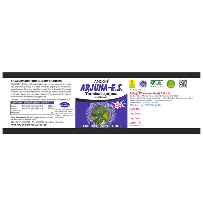 Amogh Arjuna-E.S. Terminalia Arjuna Capsule is a balanced combination of Arjuna Dry extract and Raw Arjuna. The bark from the Arjuna tree has been used for thousands of years in Ayurveda to support numerous health concerns prominently cardiovascular health. This capsule acts as a cardiac tonic and supports heart health.