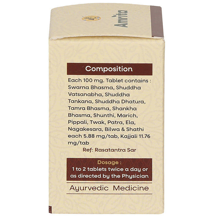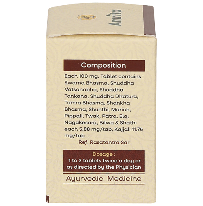 Amrita Swarna Sutshekhar Ras Tabletis a complex herbal-mineral preparation that helps manage the imbalance of doshas (Vata, Pitta and Kapha) in the human body. It is effective in managing hyperacidity, abdominal tumours, bloating, vomiting and intestinal obstruction. It is fortified with real gold and contains other heavy metal ingredients that can be taken under medical supervision only.