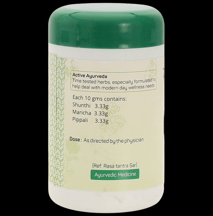 Amrita Trikatu Churna is a traditional herbal formulation containing three bitter herbs mixed together in equal quantities (Dried fruits of Piper nigrum (Kali Mirch), Piper longum (Pippali), and dried Zingiber officinale (Saunth). Trikatu churna plays an essential role in balancing aggravated Kapha in the respiratory and digestive tract. It also stimulates the stomach to produce digestive enzymes to promote the digestion of food and increase appetite. It increases the production of bile juices and bile salt secretion. In Sanskrit, Tri means three and katu means herbs that are hot and pungent, hence trikatu is the ‘Power trinity’, a combination of three powerful herbs. The formula does not have any side effects and is safe for consumption. It contains natural ingredients and is free from harmful chemicals.