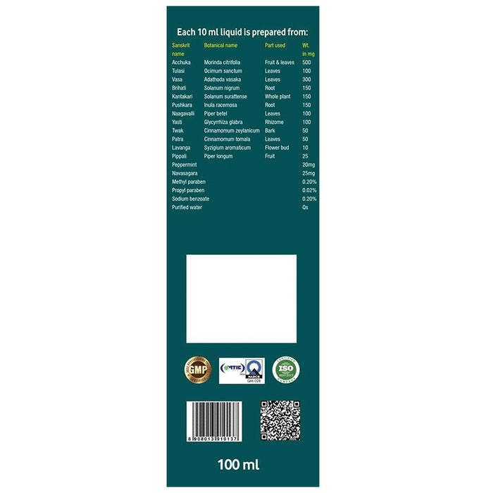 Composition : Acchuka, Tulasi, Vasa, Behati, Kantakari, Pushkara, Naagavali, Yasti, Twak, Patra, Lavanga, Pippall, Peppermint, Navasagara, Methylparaben, Propylparaben, Sodium Benzoate, Purified Water