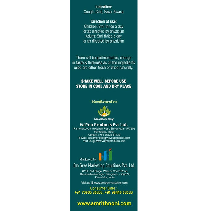 Amrith Noni Koff Clear Syrup is an Ayurvedic cough syrup that may help to provide relief and soothe coughs naturally. It is made with a blend of time-tested Ayurvedic herbs like noni, vasa, tulasi, and yashtimadhu, this syrup offers a gentle yet effective way to clear your throat and ease discomfort. This synergistic blend of powerful herbs works together and can help to provide relief from coughs, soothe a sore throat, and loosen congestion.
