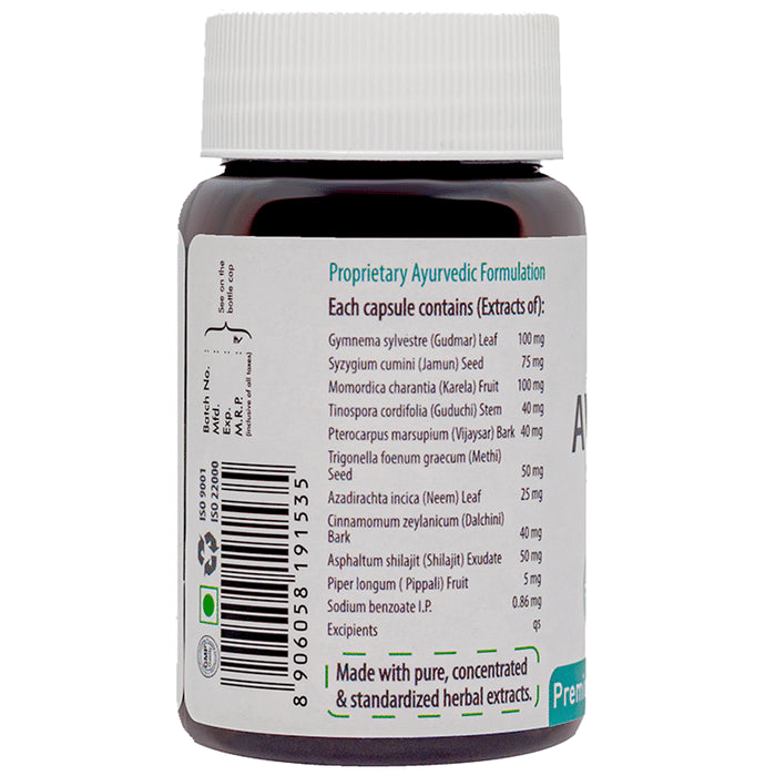 Amsarveda AV Diasol CapsuleIt is a dietary supplement formulated with karela, giloy, gudmar, shilajit, methi and neem that can manage and control diabetes. These natural ingredients help control elevated blood sugar levels in the body. It helps in enhancing insulin secretion and glucose utilisation in the pancreas.