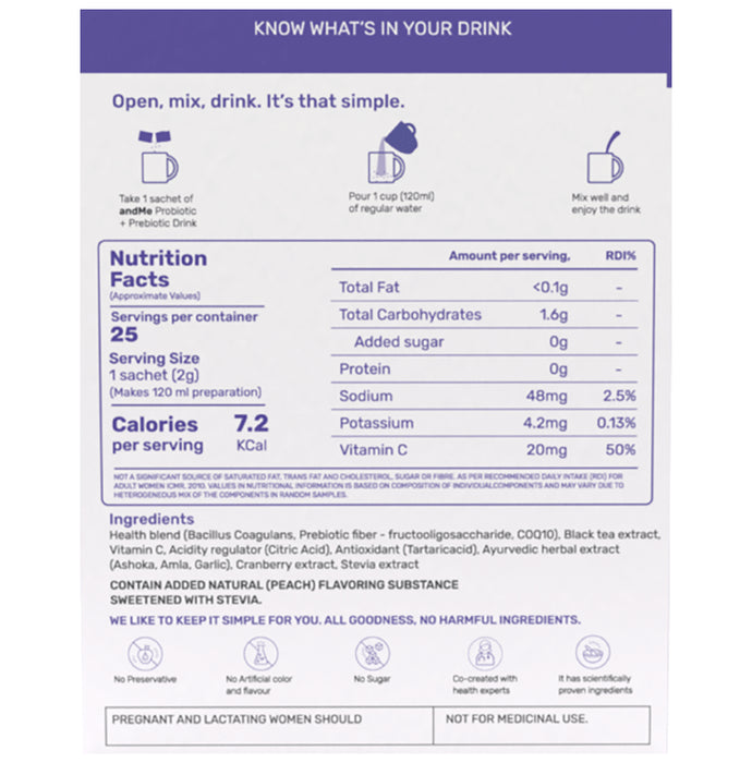 Key Ingredients of Andme Women Probiotic + Prebiotic Drink Sachet (2gm Each) Peach:Health blendBlack tea extractVitamin CAntioxidant (tartaric acidAyurvedic herbal extractCranberry extractStevia extractKey Benefits of Andme Women Probiotic + Prebiotic Drink Sachet (2gm Each) Peach:Promotes the growth of good bacteriaBalances vaginal pH levels and reduces chances of bacterial infectionAmla and Ashoka help to prevent vaginal yeast infectionHelps with gut healthNo artificial colour and flavour
