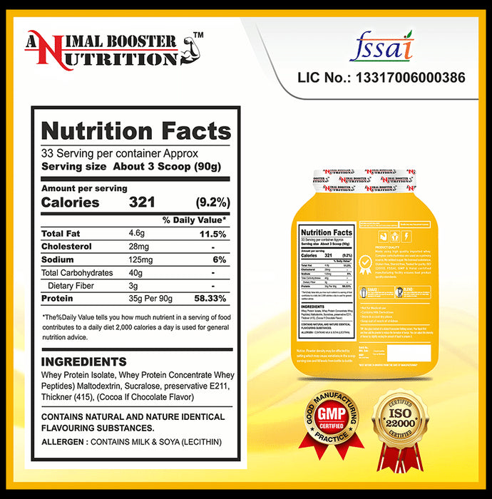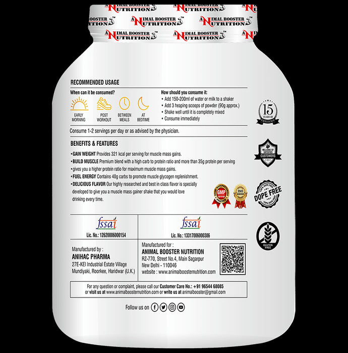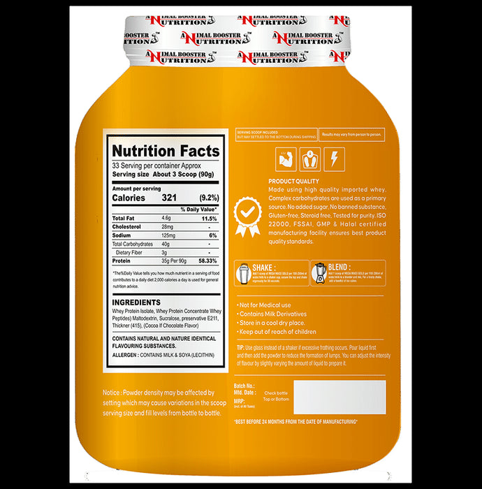 Animal Booster Nutrition Mega Mass Gold for Muscle Growth Powder Chocolate contains protein in this unique formula derived from whey and micellar casein to serve the adequate amount of calories required for bodybuilding. It can help to relieve joints, bone, and muscular pain. It helps to provide a good amount of calories for repairing and building musclesKey ingredients: