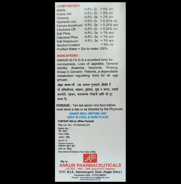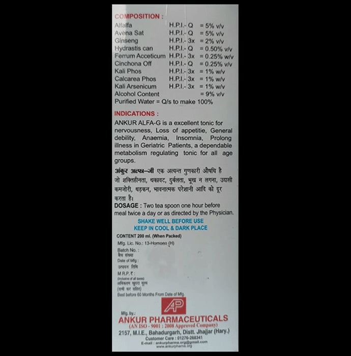 Ankur Alfa G Tonic is a homoeopathic tonic formulated to support general well-being and vitality. Made with natural ingredients such as Alfalfa, Avena Sativa, Ginseng, and Hydrastis Canadensis, this tonic may help in managing symptoms of nervousness, loss of appetite, general debility, and anaemia. Designed to support energy levels and metabolism, it is particularly beneficial for those recovering from prolonged illness or experiencing fatigue. Alfa-G is suitable for all age groups and can be used to maintain overall strength and well-being.