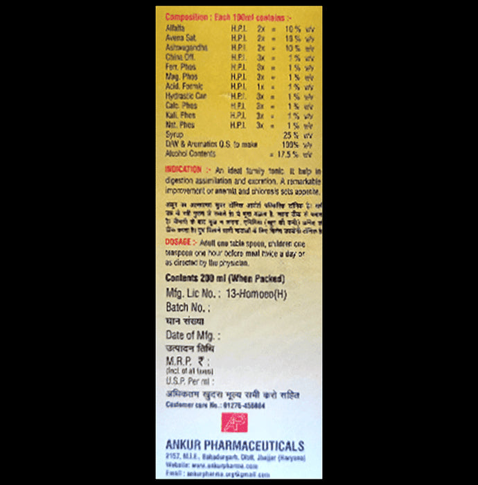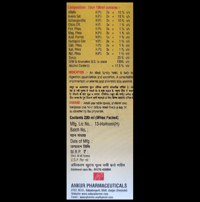 Composition : Alfalfa 2X 10%, Avena Sativa 2X 10%, Ashwagandha 2X 10%, China Officinalis 3X 1%, Ferrum Phos 3X 1%, Magnesium Phos 3X 1%, Acidum Formicum 1X 1%, Hydrastis Canadensis 3X 1%, Calcarea Phos 3X 1%, Kali Phos 3X 1%, Natrum Phos 3X 1%, Syrup 25%, D/W & Aromatics Q.S. to make 100%, Alcohol content 17.5% v/v.