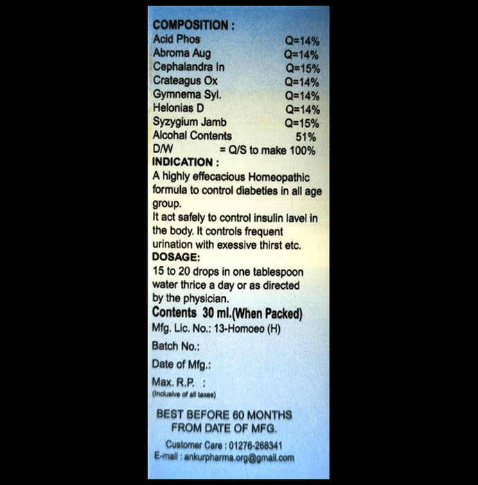 Ankur Diabo-Safe Drop is a homoeopathic herbal combination to help manage sugar levels. It acts safely to control insulin levels in the body. It controls frequent urination with excessive thirst, cramps, burning of hands and feet, and sudden weight loss.