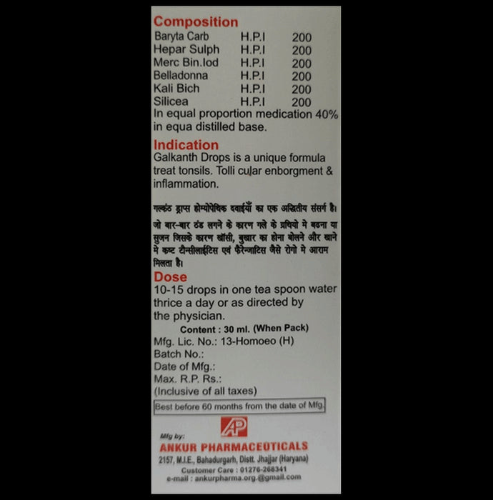Ankur Galkanth Drop is a unique formula that manages tonsil, follicular enlargement and inflammation, difficulty in breathing, greyish patches or spots in the throat and tonsil, dry cough, pharynx soreness, hoarseness, fever and vomiting due to tonsillitis.