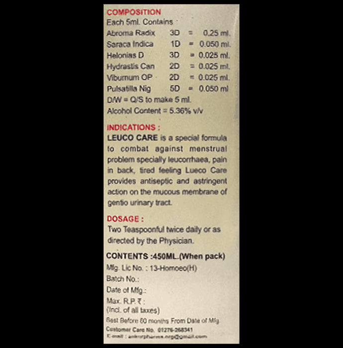 Ankur Leuco Care Syrup is a homoeopathic formulation designed to help manage concerns and discomfort related to female reproductive health. Made with a blend of natural ingredients like Abroma Radix, Saraca Indica, and Helonias Dioica, this syrup may provide astringent and antiseptic benefits to support the health of the mucous membranes in the genito-urinary tract. The mild formulation is designed to be taken daily under the guidance of a healthcare professional for long-term support during these times.