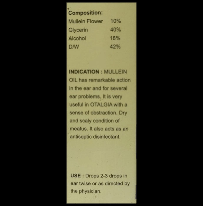 Ankur Mullein Oil has a remarkable action in the ear. It helps manage various problems like earache, otorrhea, early otitis media, tinnitus, hardened, cerumen plug and deafness. It also acts as an antiseptic and disinfectant.