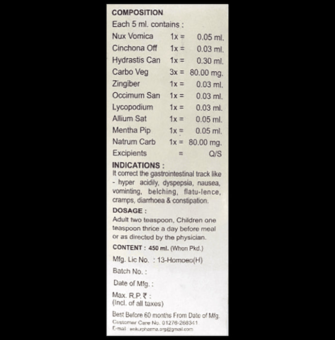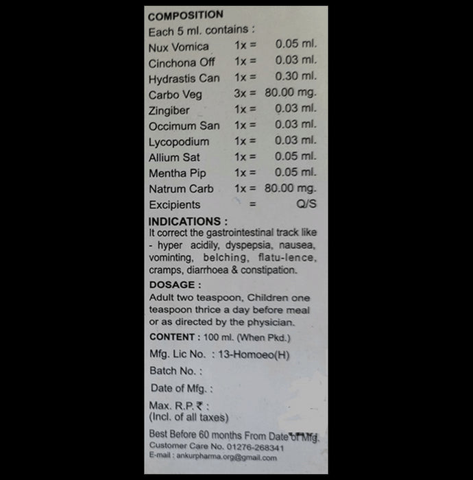 Composition : Each 5 ml contains: Nux Vomica 1X 0.05 ml, Cinchona Officinalis 1X 0.03 ml, Hydrastis Canadensis 1X 0.30 ml, Carbo Veg 3X 80.00 mg, Zingiber 1X 0.03 ml, Ocimum Sanctum 1X 0.03 ml, Lycopodium 1X 0.03 ml, Allium Sativum 1X 0.05 ml, Mentha Piperita 1X 0.05 ml, Natrum Carbonicum 1X 80.00 mg, Excipients Q/S.