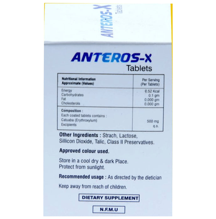 Anteros-X TabletIt is a dietary supplement formulated with catuaba, which has anti-inflammatory, antidepressant, neuroprotective, and antioxidant properties. It helps to manage fatigue, stress, and memory loss.