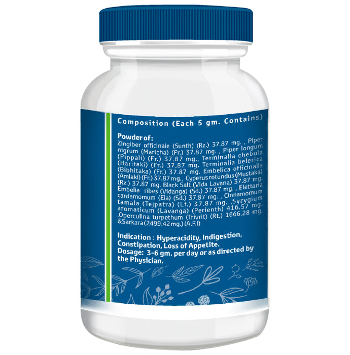 Composition : Zingiber Officinale (sunth) (rz.) 37.87 Mg, Piper Nigrum (maricha) (fr.) 37.87 Mg.,Piper Longum (pippali) (fr.) 37.87 Mg., Terminalia Chebula (haritaki) (fr.) 37.87 Mg, Terminalia Belerica (bibhitaki) (fr.) 37.87 Mg. , Emblica Officinalis (amalaki) (fr.) 37.87 Mg., Cyperus Rotundus (mustaka) (rz.) 37.87 Mg, Black Salt (vida Lavana) 37.87 Mg, Embelia Ribes (vidanga) (sd.) 37.87 Mg., Elettaria Cardamomum (ela) (sd.) 37.87 Mg., Cinnamomum Tamala (tejpatra) (lf.) 37.87 Mg., Syzygium Aromaticum (lavanga) (perienth) 416.57 Mg., Operculina Turpethum (trivrit) (rt.) 1666.28 Mg., Sarkara (2499.42 Mg.)