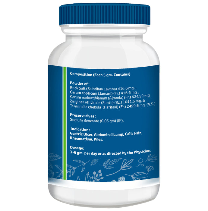 Composition : Rock Salt (Saindhava Lavana), Carum Copticum (Jamani) (Fr.), Carum Roxburghianum (Ajamoda) (Fr.), Zingiber Officinale (Sunth), Terminalia chebula (Haritaki) (Fr.)