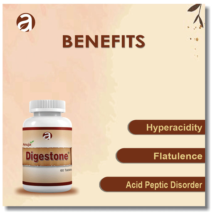 Anuja Disgestone Tabletis a herb-based tablet that provides relief from gas and bloating. It not only supports regular bowel motions but also aids in digestion. This tablet can be effective in constipation, indigestion and acidity and helps to fight flatulence. It also improves one's overall health and well-being.