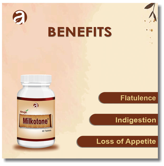 Anuja Milktone Tabletis a natural remedy that helps enhance lactation and may increase breast milk in lactating mothers. This ayurvedic supplement is formulated with energy-boosting ingredients and lactation aiding ingredients that are natural, safe, nonhormonal and free from side effects. Moreover, it helps new moms regain strength and improve their iron(haemoglobin) and calcium levels.