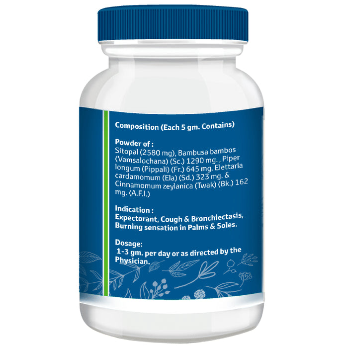 Composition : Sitopal, Bambusa Bambos (vamsalochana) (s.c.), Piper Longum (pippali) (fr.), Elettaria Cardamomum (ela) (sd.), Cinnamomum Zeylanica (twak) (bk.)