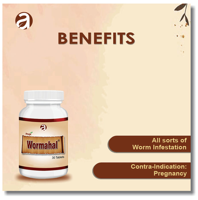 Anuja Wormahal Tabletis an ayurvedic formulation that can be effective in parasitic infections affecting the digestive tract. It aims to regulate all the organs in the body and improve immunity. It can reduce diseases like roundworms, tapeworms, pinworms, hookworm, or threadworm and may prevent the symptoms like nausea, vomiting, loose motions and itching at the anus.