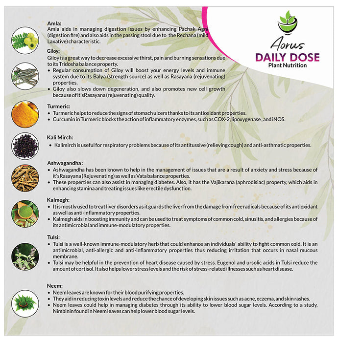 Aorus Daily Dose Tabletis an immunomodulatory formulation that helps fight against diseases and keeps you strong and active throughout. It also possesses rejuvenating properties that help prevents degeneration and maintain youthfulness.