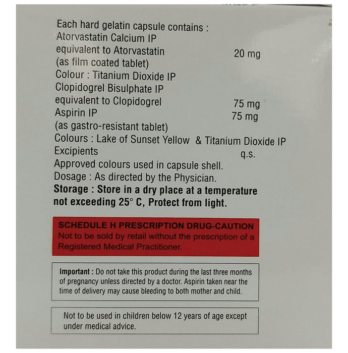 Composition : Aspirin (75mg) + Atorvastatin (20mg) + Clopidogrel (75mg)