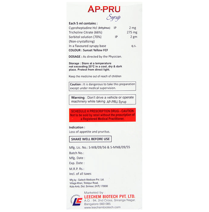 Ap-Pru Syrup is a combination medicine used to treat loss of appetite. It is an effective appetite stimulant. It works by reducing the effect of a chemical messenger which regulates appetite. Ap-Pru Syrup is taken with or without food in a dose and duration as advised by the doctor. The dose you are given will depend on your condition and how you respond to the medicine. You should keep taking this medicine for as long as your doctor recommends. Let your healthcare team know about all other medications you are taking as some may affect, or be affected by this medicine.The most common side effects are constipation, dryness in the mouth, and blurred vision. Most of these are temporary and usually resolve with time. Contact your doctor straight away if you are concerned about any of these. It can cause dizziness, so do not drive or do anything that requires mental focus until you know how this medicine affects you. Avoid drinking alcohol while taking this medicine as it can worsen your sleepiness.Before taking Ap-Pru Syrup, inform your doctor if you have any kidney or liver diseases so that your doctor can prescribe a suitable dose for you. Pregnant or breastfeeding women should also consult their doctor before taking this medicine.