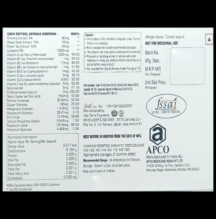 Composition : Ginseng Extract. 3% 90mg, Grape Seed Extract 10% 10mg, Green Tea Extract 10% 25mg Lycopene 6% 1000mcg, Vitamin A las Retinyl Palmitate) 500mcg, Vitamin B1 (as Thiamine mononitrate) 1mg, Vitamin B2 (as Riboflavin)1.5mg, Vitamin B6 (as Pyridoxine hydrochloride) 1mg, Vitamin B12 (as Cyanocobalamin)1.5mg Vitamin C as L-ascorbic acid) 15mg, Vitamin D3 (cholecalciferol 200IU, Vitamin E (as DL-alpha-tocopheryl acetate) 5mg, Nicotinamide 5mg, D-Pantothenate Calcium 5mg, Dietary Folate las Folic acid) 150mcg, Ferrous Fumarate 30.64mg, Copper Sulphate 1.96mg, Manganese Sulphate Magnesium Sulphate 1538mg' Zinc Oxide 12.45mg, Calcium Phosphate Dibasic 254.6mg, Potassium Iodide 130.8mcg, Potassium Sulphate 4.456mg
