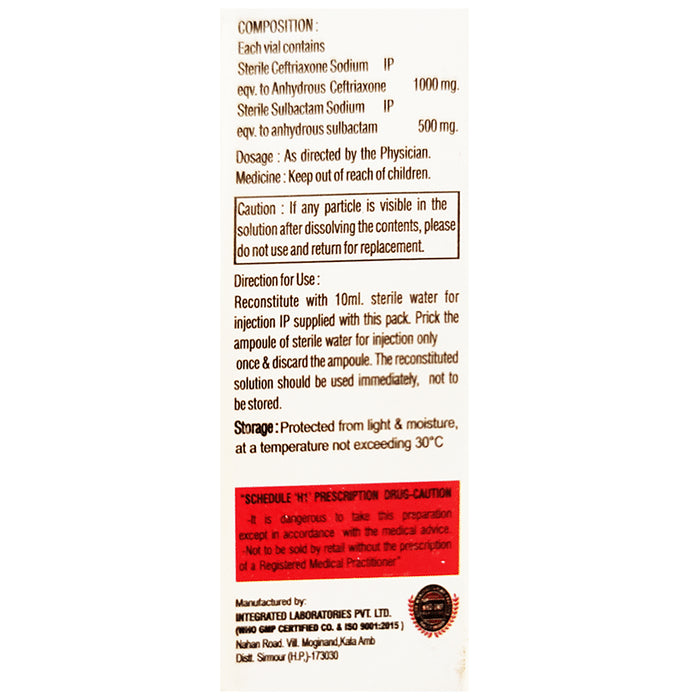 Composition : Ceftriaxone (1000mg) + Sulbactam (500mg)
