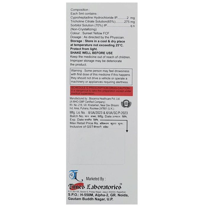Composition : Cyproheptadine (2mg/5ml) + Tricholine Citrate (275mg/5ml)