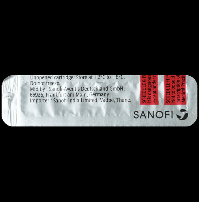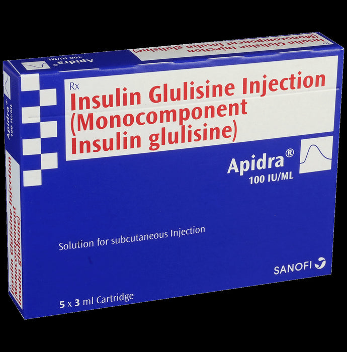 Apidra 100IU Cartridge (3ml Each) is used to improve blood sugar control in people with type 1 and type 2 diabetes mellitus. It is a fast-acting type of insulin that helps to lower blood sugar levels after meals and reduce the chances of developing serious complications of diabetes. Apidra 100IU Cartridge (3ml Each) is normally prescribed along with a long-acting type of insulin or other diabetes medicines. Your doctor or nurse will teach you the correct way of injecting it under the skin. It should be taken 15 minutes before a meal or within 20 minutes after starting a meal. Do not stop taking it unless your doctor tells you to. It is only part of a treatment program that should also include a healthy diet, regular exercise, and weight reduction as advised by your doctor.Check your blood sugar levels regularly, keep track of your results and share them with your doctor. This is very important to work out the correct dose of the medicine for you.The most common side effects of this medicine include hypoglycemia, allergic reactions, injection site reactions, lipodystrophy, itching, rash, and upper respiratory tract infections. To prevent these, it is important to always inject the correct dose of medicine, have regular meals (do not skip), and monitor your blood sugar levels regularly.Do not use this medicine when you have low blood sugar levels (hypoglycemia). Tell your doctor if you have ever had kidney, liver, or heart problems before starting treatment. Pregnant or breastfeeding women should consult their doctor before using it.