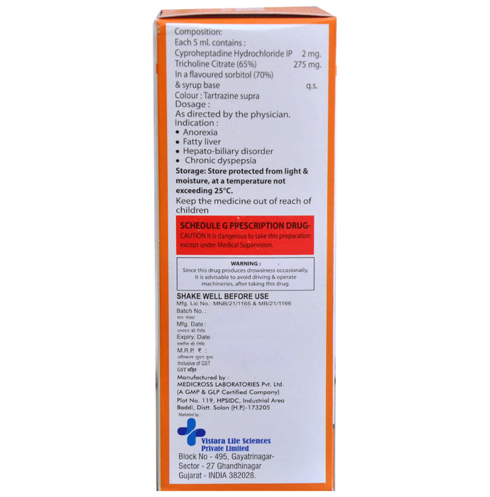 Composition : Cyproheptadine (2mg/5ml) + Tricholine Citrate (275mg/5ml) + Sorbitol (3.575gm/5ml)